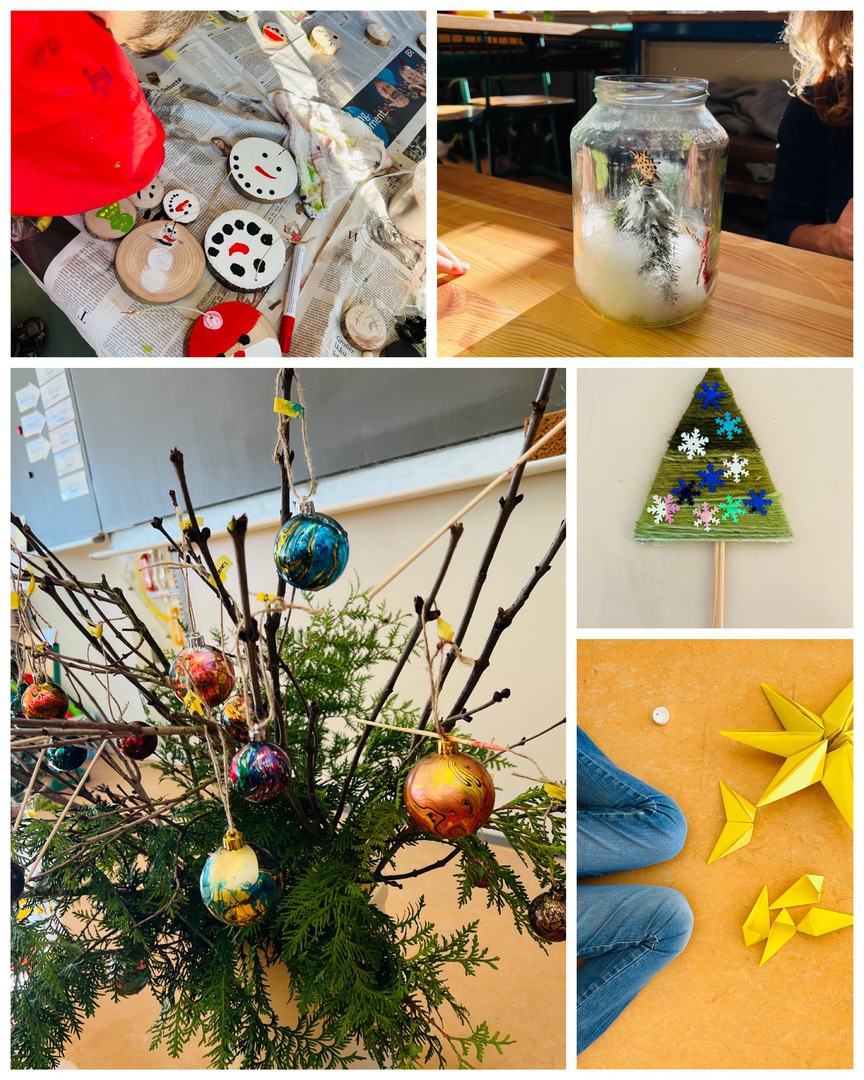In den einzelnen Gruppen entstanden die unterschiedlichsten weihnachtlichen Kunstwerke. Mit viel Geduld und Kreativität wurden Glitzersterne gefaltet, Baumscheiben bemalt und stimmungsvolle Wintergläser gestaltet. Besonders beliebt waren auch die mit Wolle gewickelten Tannenbäume sowie die bunt marmorierten Weihnachtskugeln, die später den Weihnachtsbaum schmücken sollten.