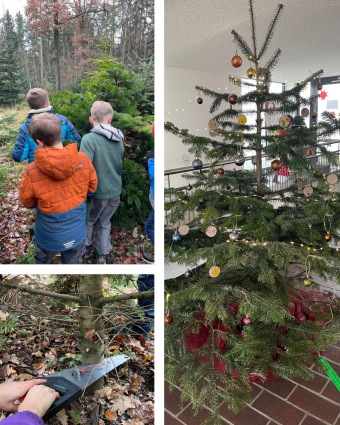 Zurück in der Schule wurde der Baum oben vor dem Lehrerzimmer aufgestellt und mit unserem selbstgebastelten Schmuck geschmückt. Nun kann die Adventszeit kommen!