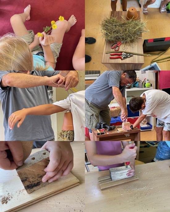 Anschließend stand die praktische Arbeit im Vordergrund. Die Kinder mussten viel handwerklich arbeiten: Bohren, Schleifen, Hämmern und Zusammenbauen gehörten zu den Aufgaben, um die Häuser stabil und attraktiv für Wildbienen und Ohrenzwicker zu gestalten. Dabei war Teamarbeit gefragt, um die verschiedenen Schritte erfolgreich umzusetzen.
