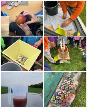 Anschließend wurde es praktisch: An verschiedenen Stationen durften wir selbst Hand anlegen. Mit einer Schüttelstange brachten wir die Äpfel von den Bäumen, sammelten sie auf, wuschen und schnitten sie. Danach ging es zur Apfelmühle, in der die Früchte zu Maische verarbeitet wurden. Der Höhepunkt war die Handpresse auf der Wiese, mit der wir den frischesten Apfelsaft überhaupt herstellen konnten.